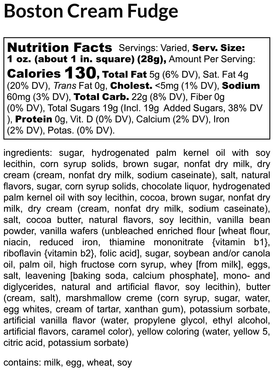 All of our fudge may contain trace amounts of nuts, milk proteins, egg, gluten and peanuts that are used at our facility.