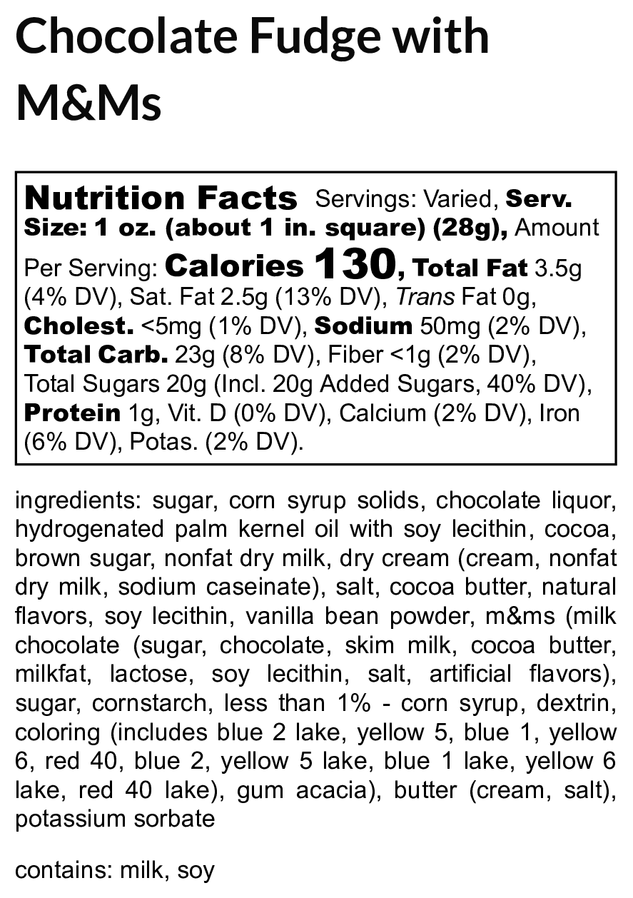 All of our fudge may contain trace amounts of nuts, milk proteins, gluten and peanuts that are used at our facility.