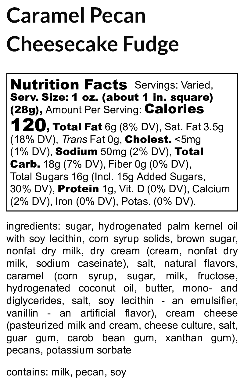 Allergen alertAll of our fudge may contain trace amounts of nuts, milk proteins, gluten and peanuts that are used at our facility.