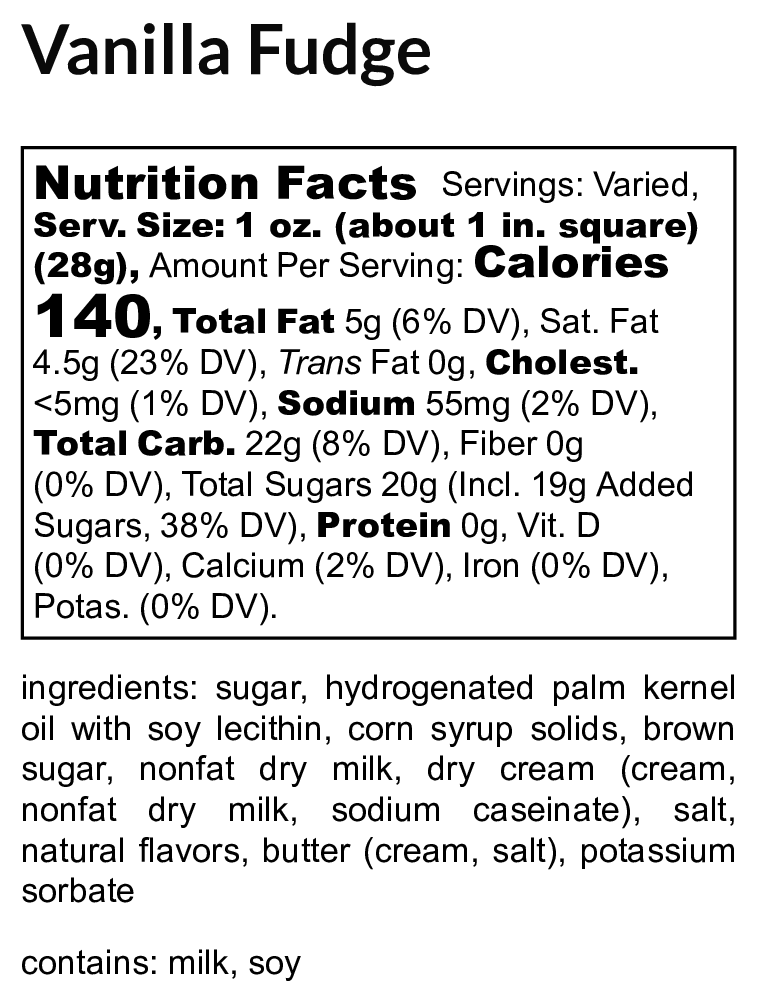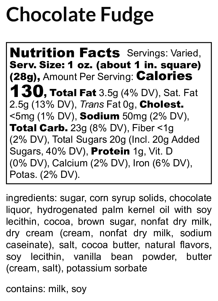 All of our fudge may contain trace amounts of nuts, milk proteins, gluten and peanuts that are used at our facility.
