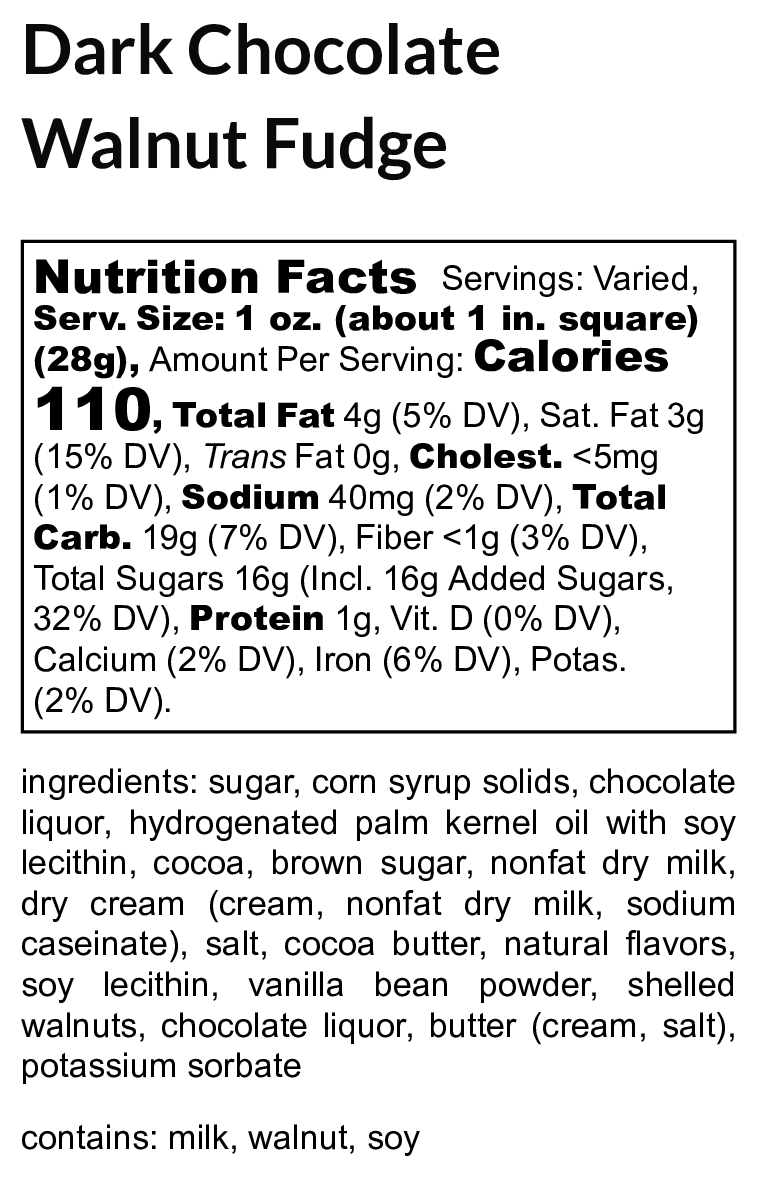 The total package for fudge perfection! Divinely satisfying, velvety, dark chocolate with chunks of crunchy walnuts. Uncle Butch’s Dark Chocolate Walnut Fudge is a delicious fudge nutty goodness! Rich but not overly sweet and the walnuts add a fun, delicious texture to this creamy fudge. An ideal treat for both chocolate and nut lovers, Uncle Butch’s Dark Chocolate Walnut Fudge pairs perfectly with a tall, cold glass of milk and is an excellent treat for a family picnic, kids birthday party, for a special occasion or just for fun!