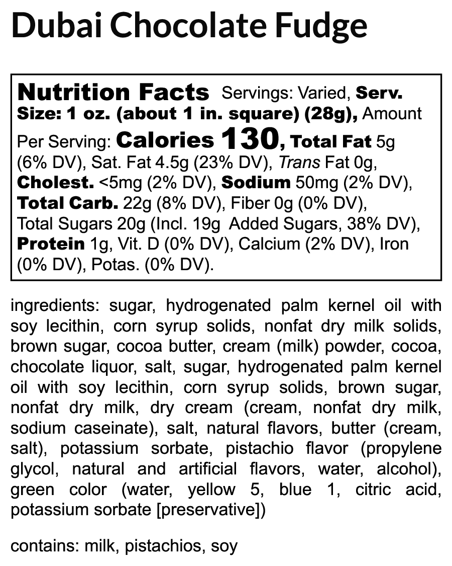 Inspired by Dubai's opulence and warmth, get ready to experience the luxurious taste of our Dubai Chocolate Fudge. Close your eyes and savor the finest smooth cocoa flavor with a touch of golden pistachio sandwiched between the layers of milk chocolate fudge. Perfectly balanced and elegantly simple, this fudge is a decadent treat for those who appreciate life's finer flavors.