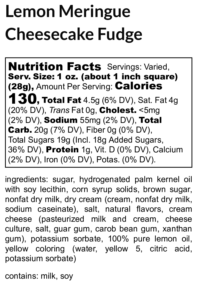For all lemon fans, we’ve created a masterpiece and this one is for you! A delightful and light combination of tangy lemon with a creamy, fluffy meringue flavor that’s Oh so yummy! Uncle Butch’s Lemon Meringue Cheesecake Fudge is made with real sugar and real cream cheese. This ultra-silky fudge is a refreshing, indulgently zesty, sugary, pillowy, sunny treat! It is a spring and summertime favorite that really is perfect for any occasion. Sample and experience a bright, heavenly explosion in every bright.