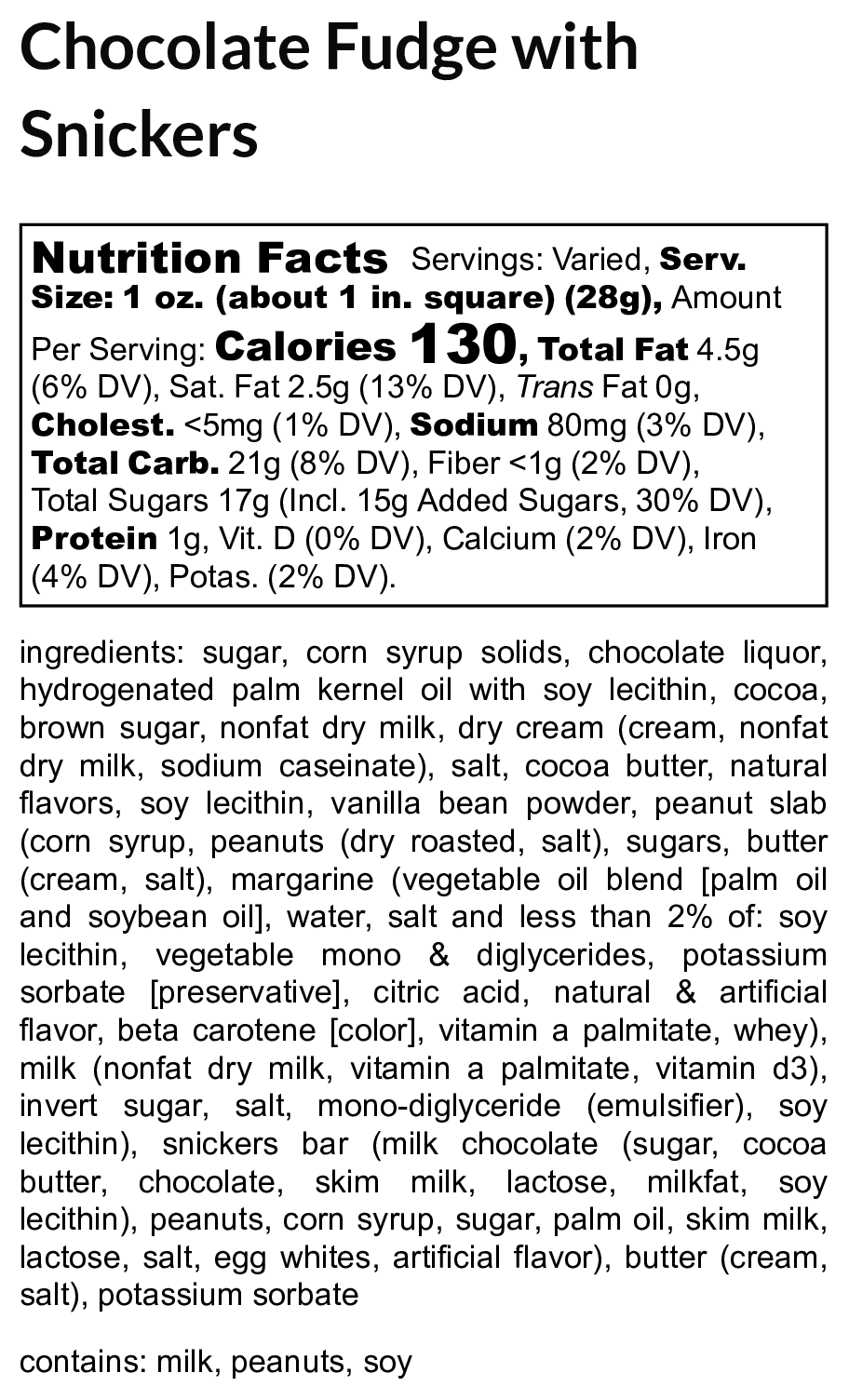All of our fudge may contain trace amounts of nuts, milk proteins, gluten and peanuts that are used at our facility.