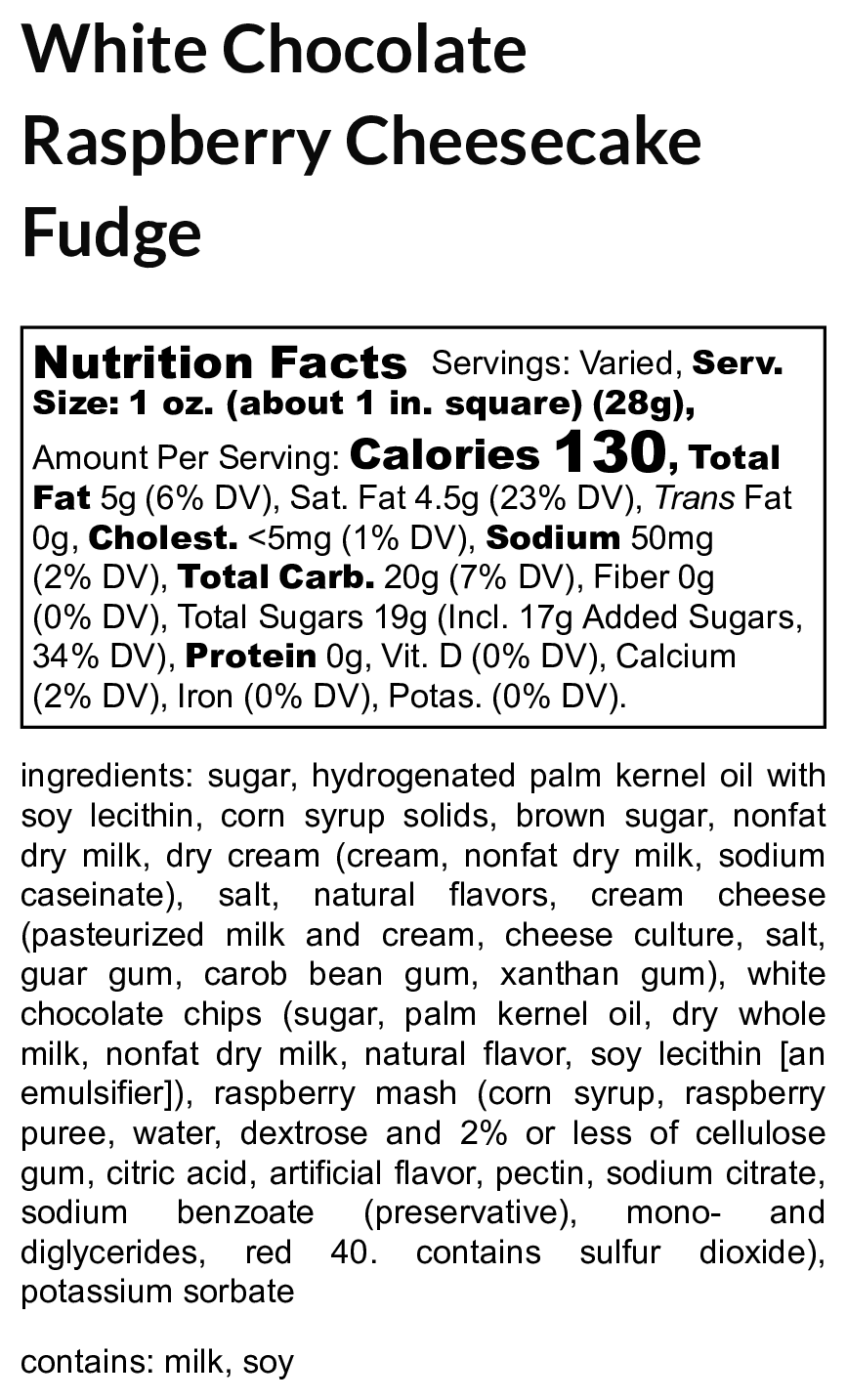 A beautiful, dreamy combination of creamy white chocolate and tangy cheesecake flavors swirled with ribbons of vibrant raspberry goodness sprinkled with white chocolate chips. Every slice is the perfect balance of sweet and tart, with a velvety smooth texture that melts in your mouth. Whether you’re treating yourself or someone special, this fudge is a luxurious dessert experience that’s impossible to resist!